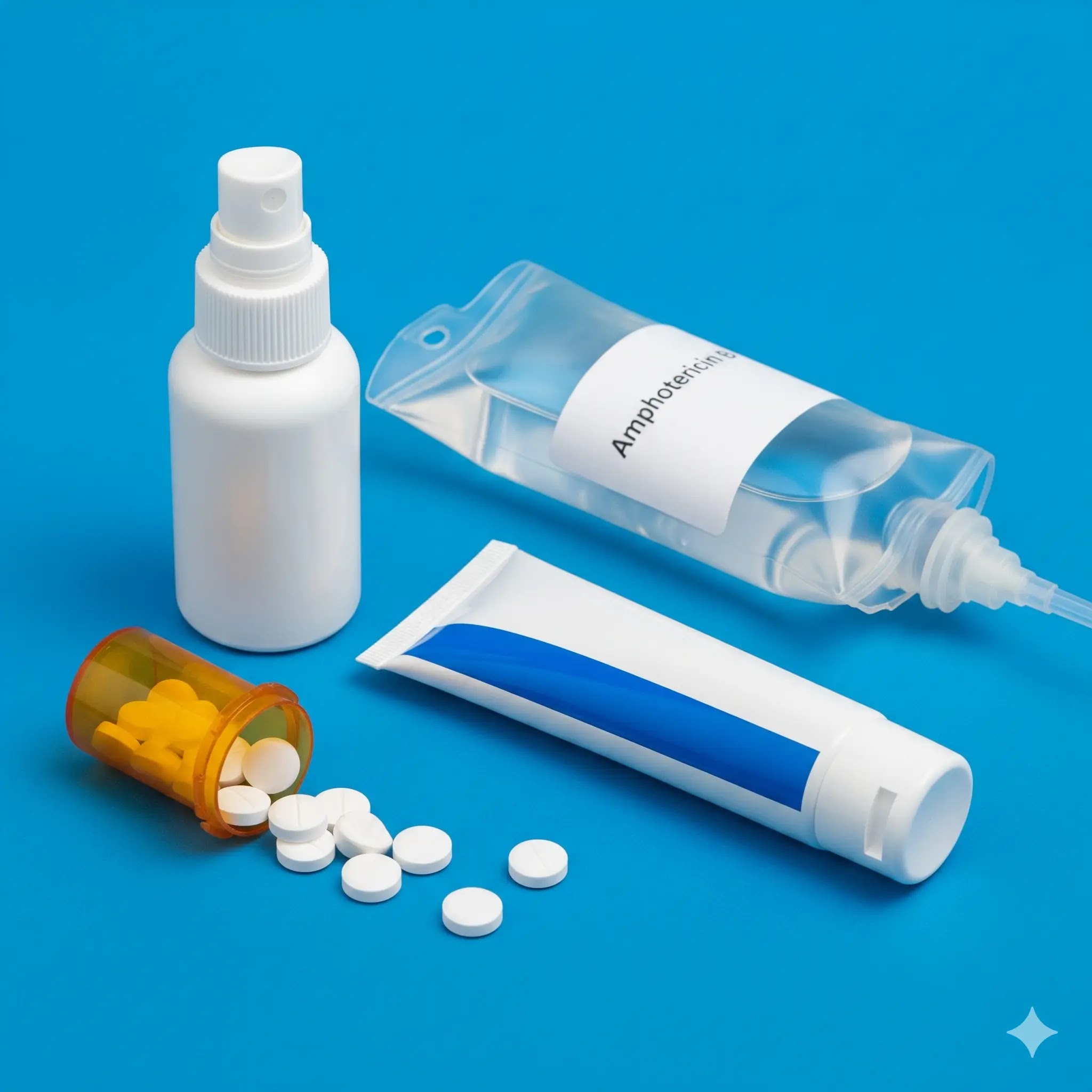 A flat lay arrangement of common antifungal treatments, including topical cream, spray powder, oral medication pills, and an IV bag