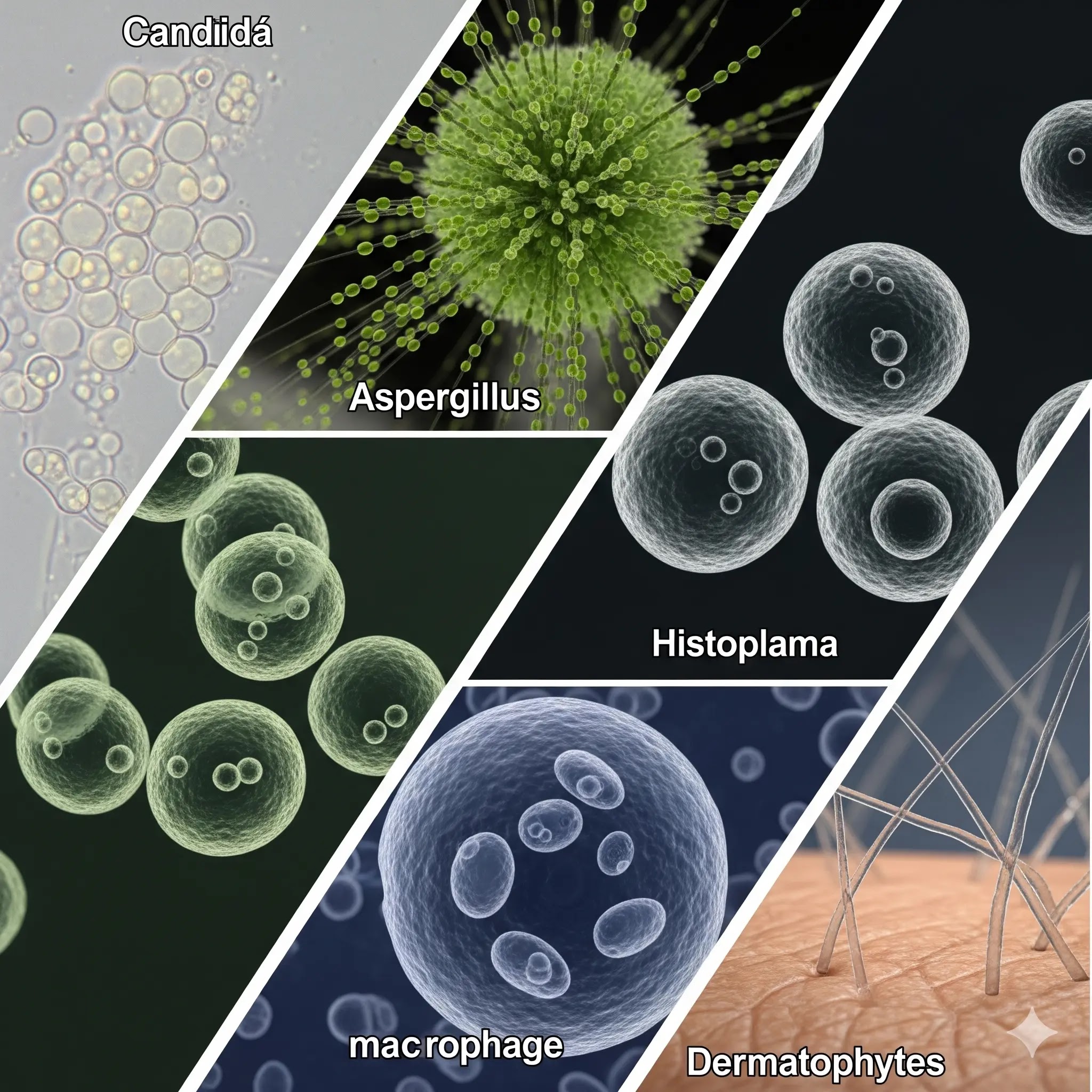 A collage of five microscope images showing the different structures of common fungi that cause infections: Candida, Aspergillus, Cryptococcus, Histoplasma, and Dermatophytes
