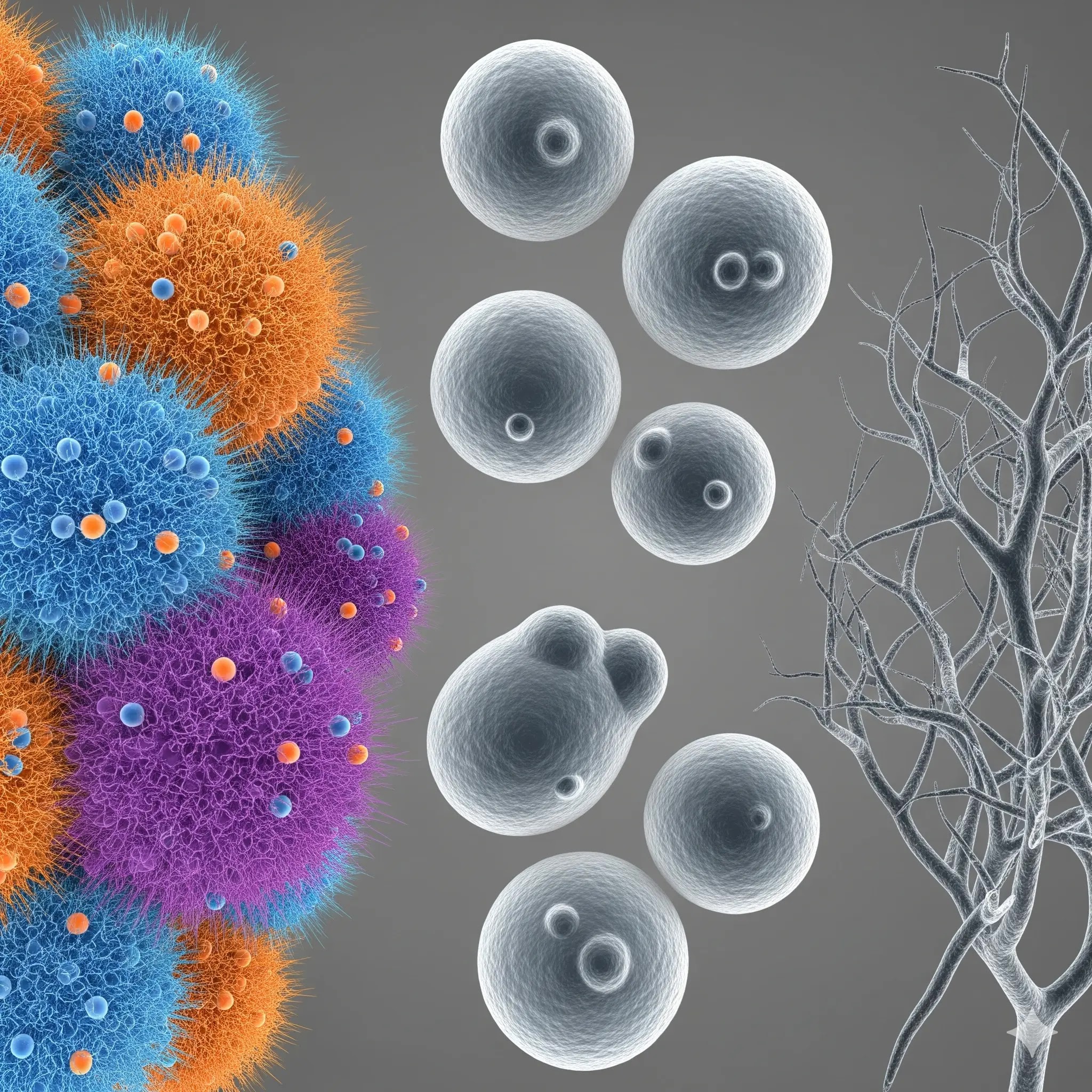 A detailed 3D scientific illustration showing various types of fungi, including green mold, yeast cells, and branching hyphae, on a grey background. Fungal infections types causes symptoms treatment