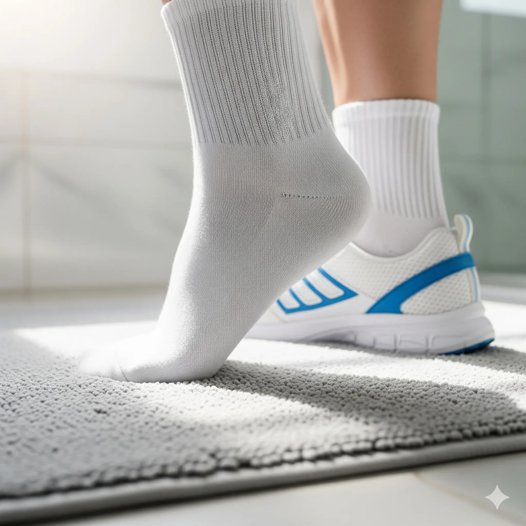 A person's feet wearing clean, white athletic socks and lacing up a breathable running shoe, emphasizing foot hygiene.
