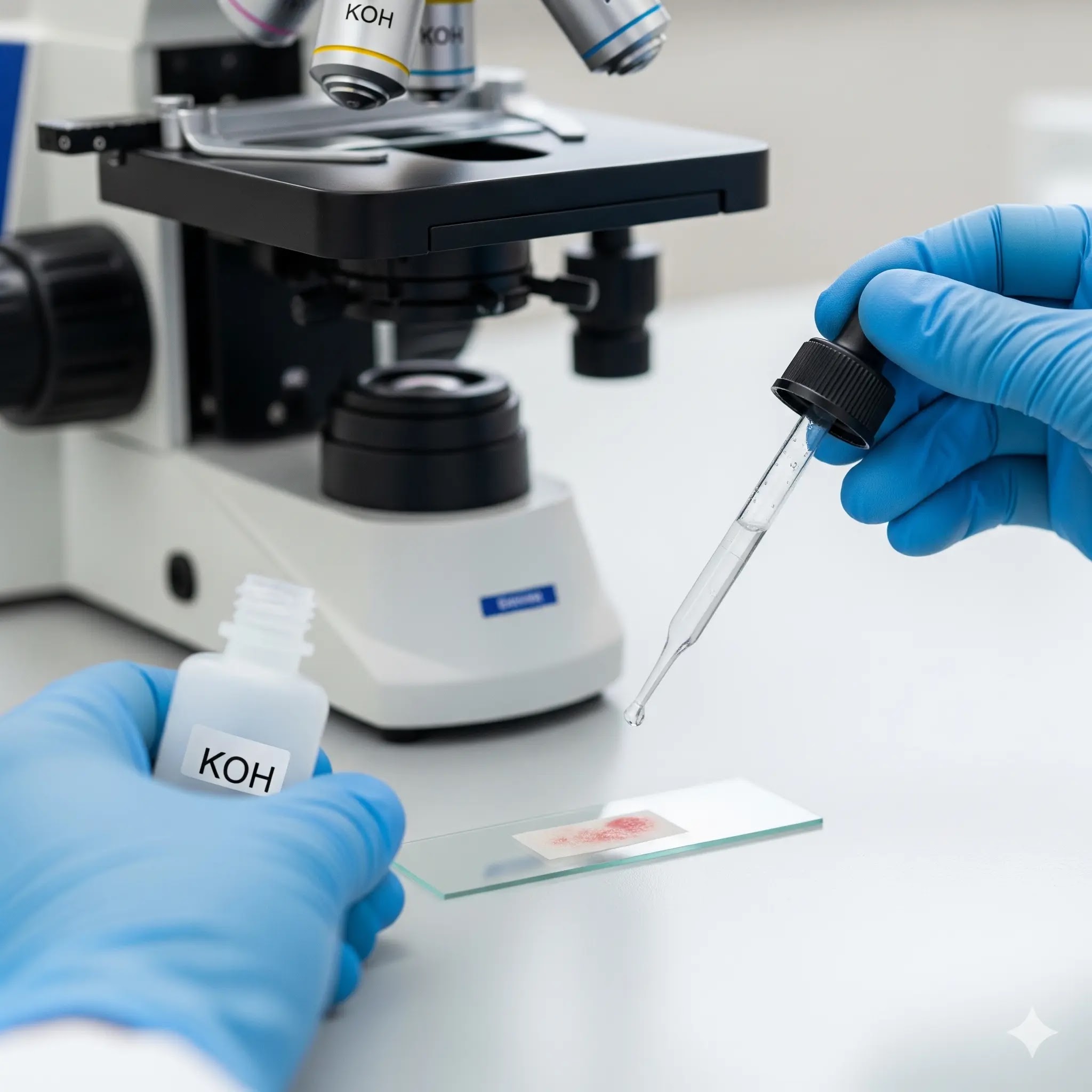 • Microscopy: A skin scraping or nail clipping sample, hair or bodily fluid may be subjected to a potassium hydroxide (KOH) solution and viewed through a microscope. Human cells are dissolved by the KOH and any fungal components (hyphae or yeast cells) are easier to observe.