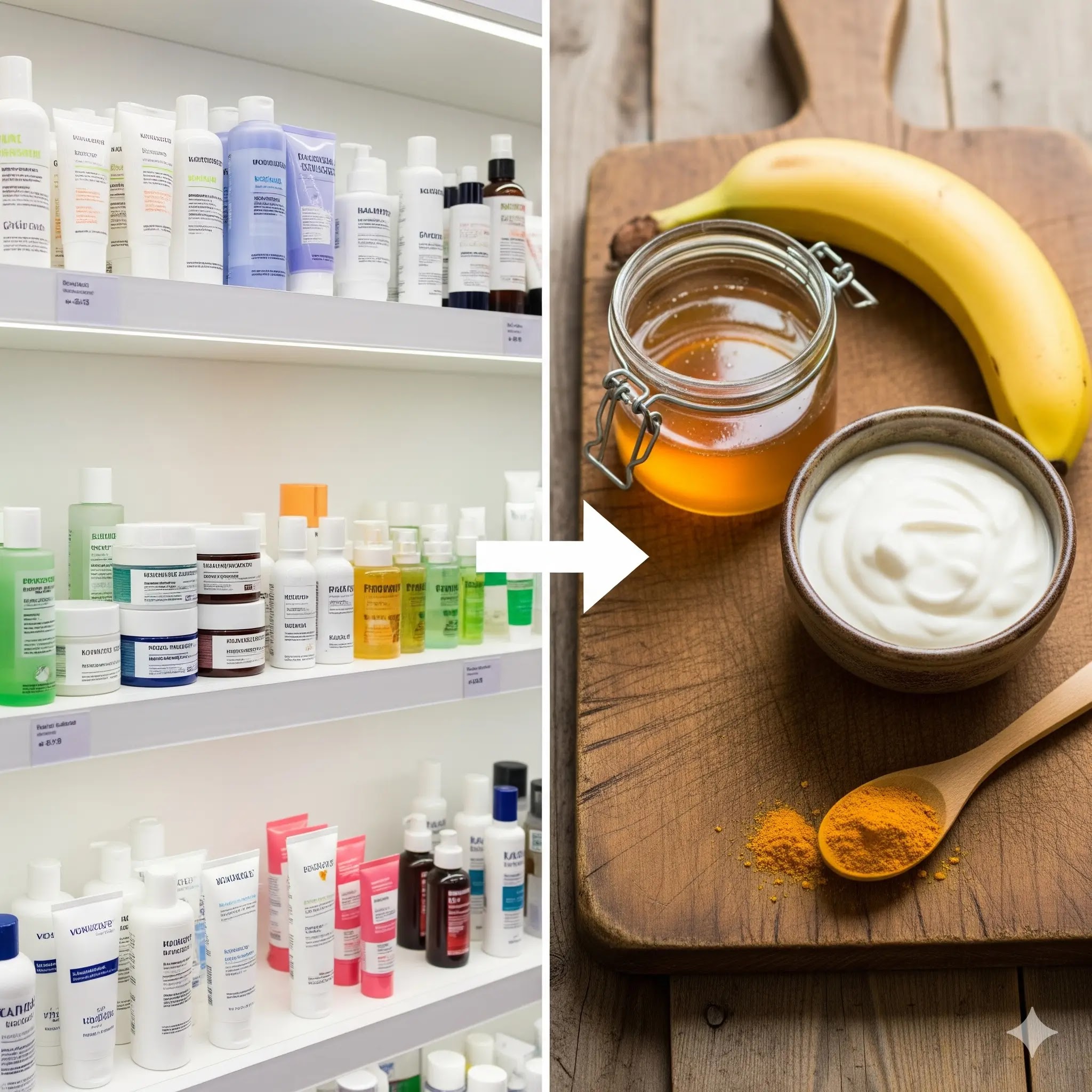 Split image comparing commercial skincare products on a shelf to simple, natural ingredients like honey and fruit on a wooden board.