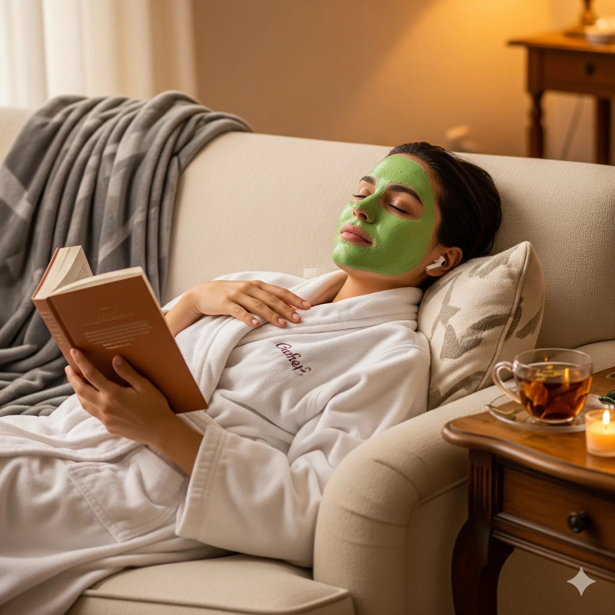 Woman relaxing with a green homemade face mask applied, reading a book during the treatment time.