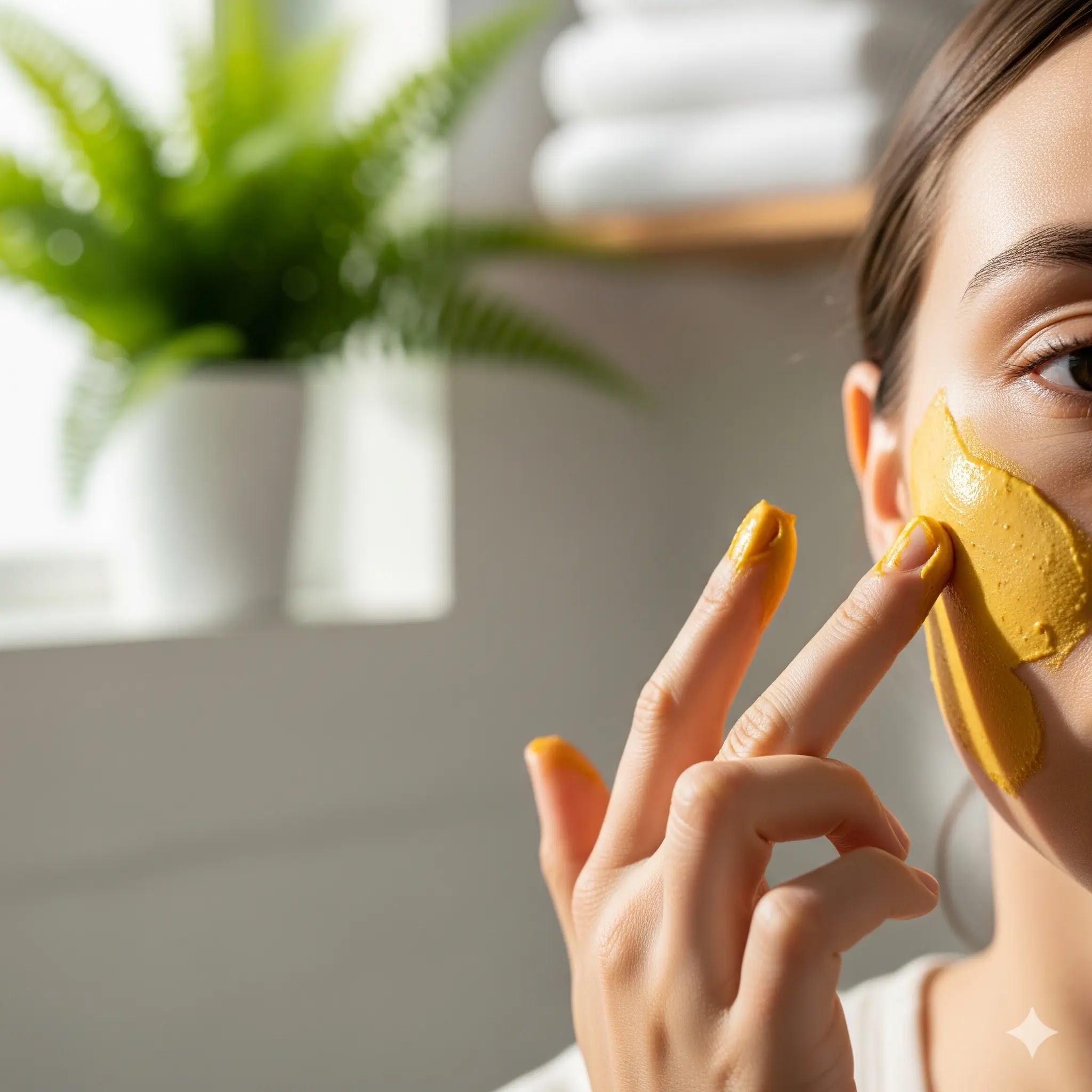 Close-up of hands gently applying a homemade golden turmeric and honey face mask for glowing skin.