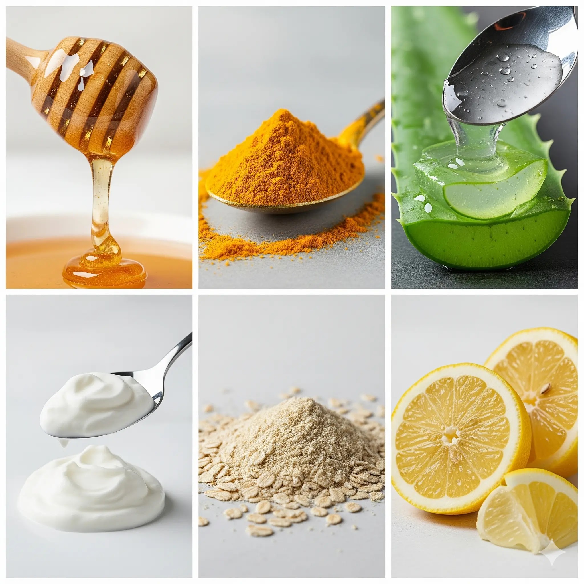 Grid of six macro photos showing key natural skincare ingredients: honey, turmeric, aloe vera, yogurt, oatmeal, and lemon.