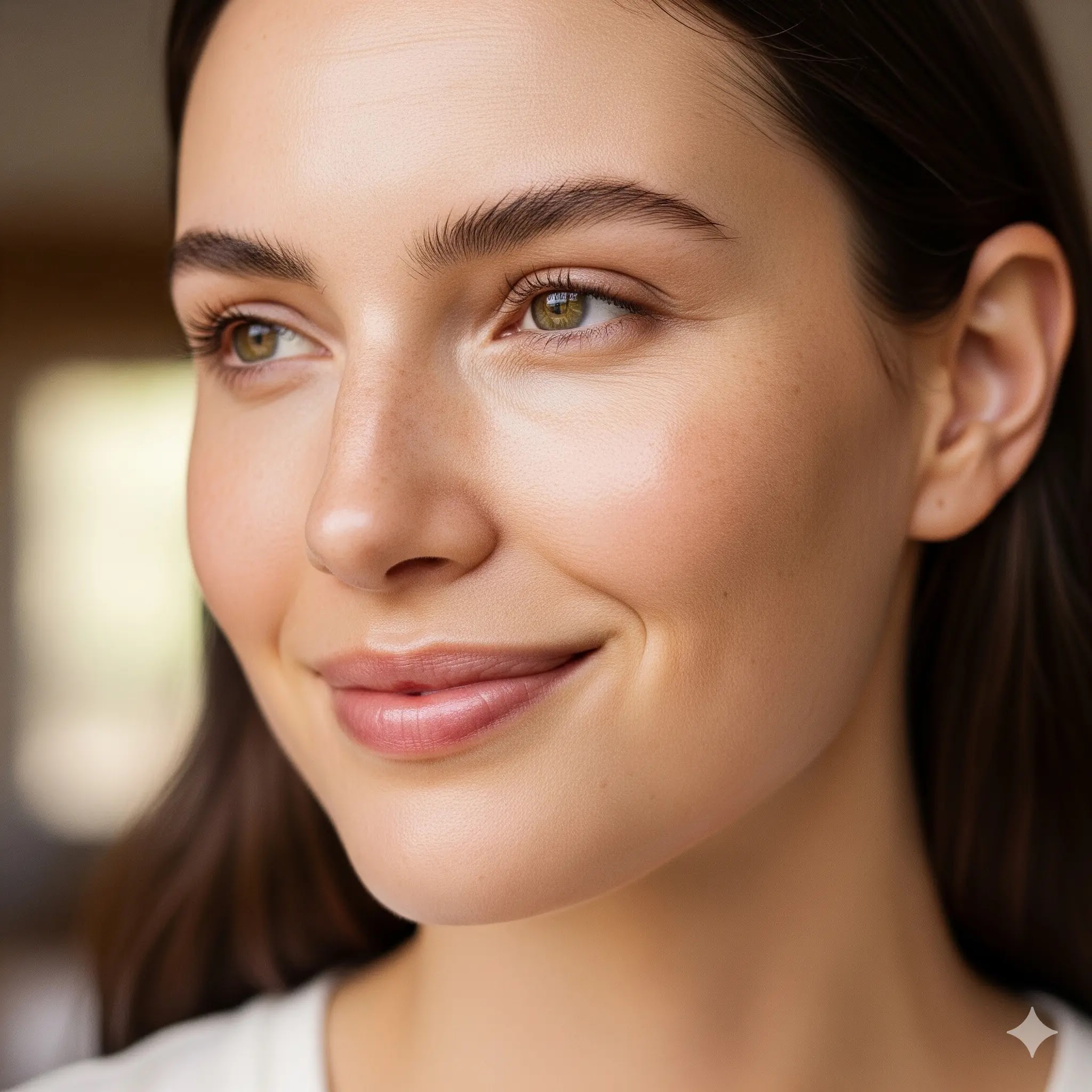 Close-up portrait of a woman with confident, glowing, natural skin and a serene smile.