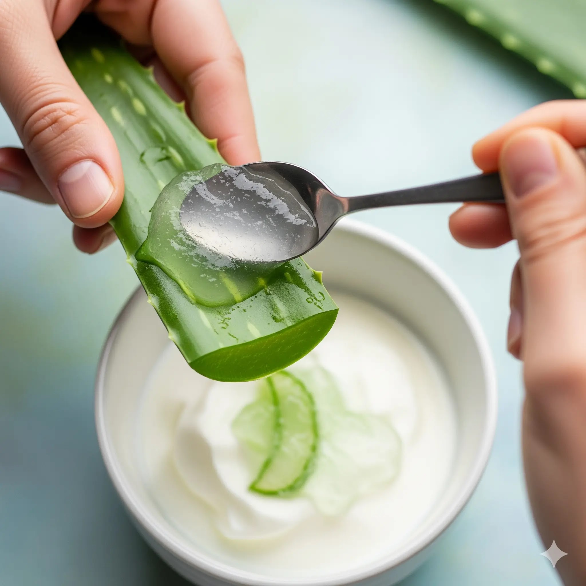 Scraping fresh aloe vera gel into a bowl of yogurt to make a soothing, hydrating DIY face mask.