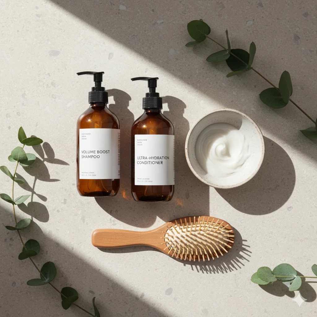 Overhead flat lay of shampoo, conditioner, a hairbrush, and natural elements for hair care.