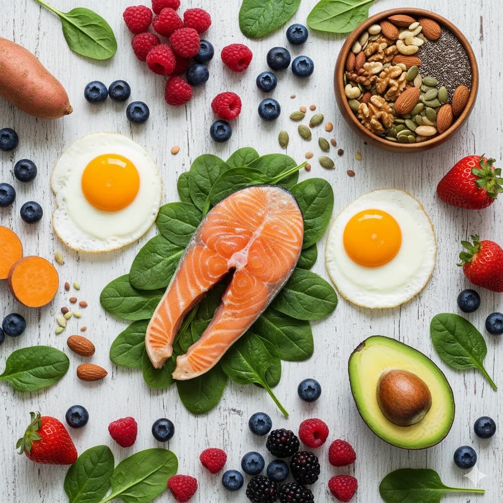 Flat lay of healthy foods for hair growth including salmon, eggs, spinach, nuts, and berries.