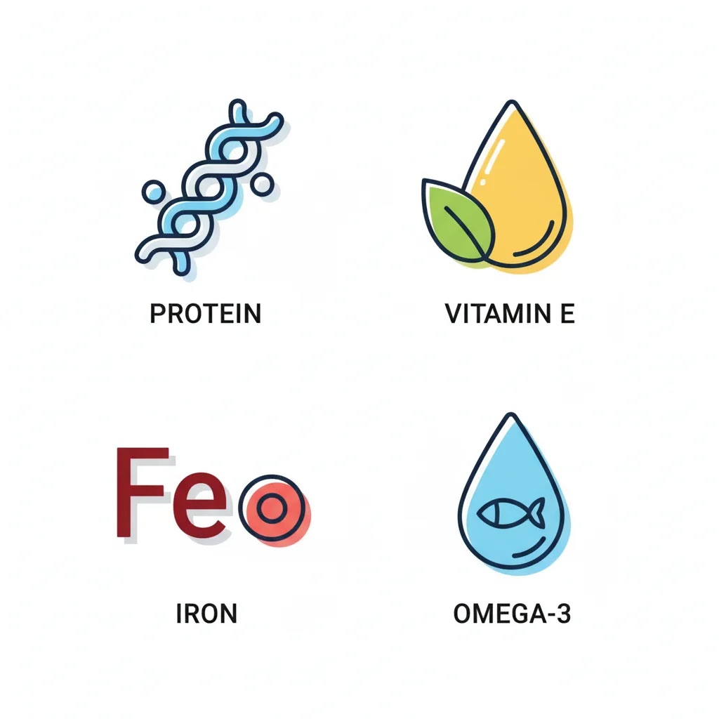 Set of simple icons representing Protein, Vitamin E, Iron, and Omega-3 for hair health.