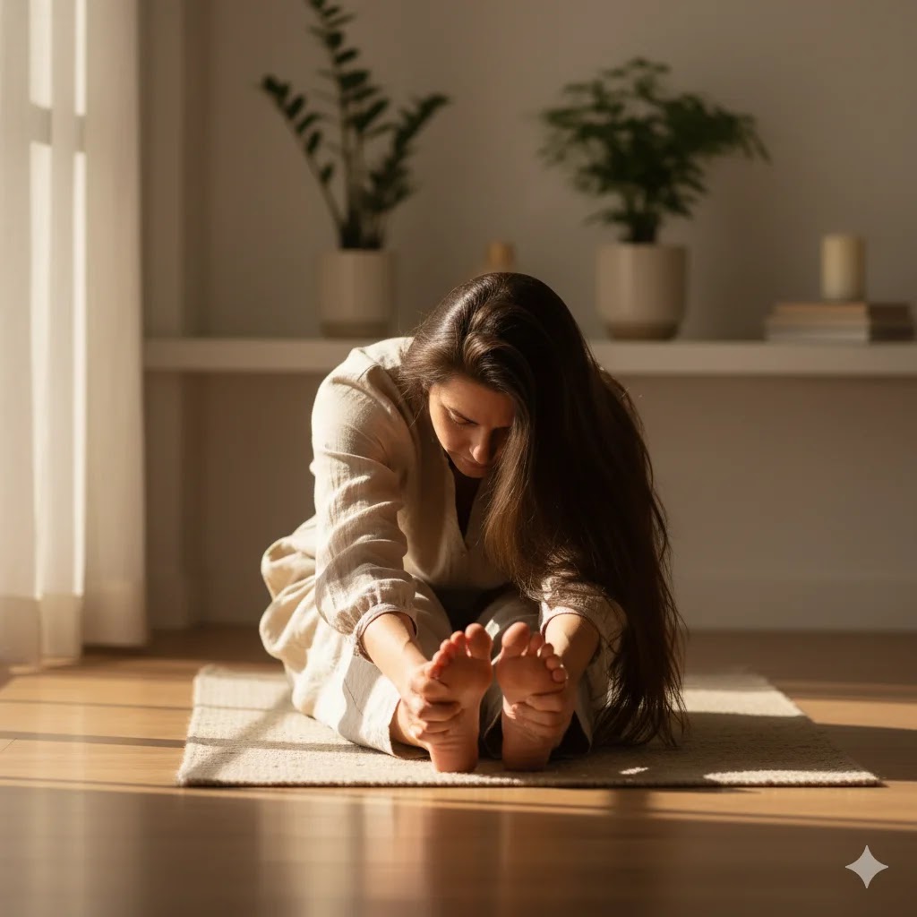Woman practicing yoga in a peaceful, sunlit room for stress relief and hair health.