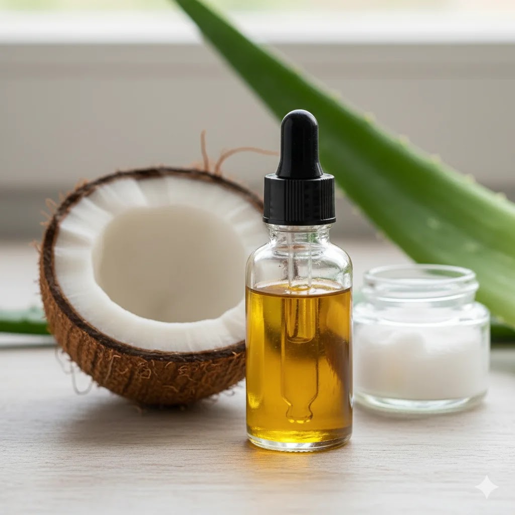Natural still life with bottles of argan oil and coconut oil next to an aloe vera leaf.