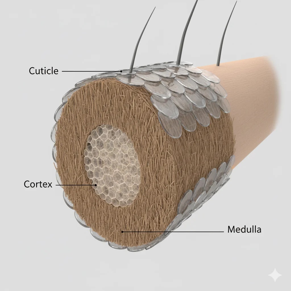 Detailed 3D cross-section diagram of a human hair strand showing the cuticle, cortex, and medulla layers.