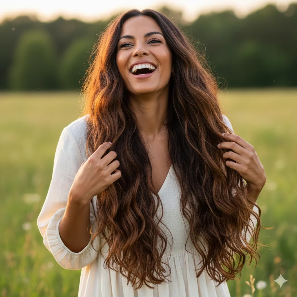 A confident woman with shiny, healthy long hair laughing joyfully. How to Maintain Strong and Healthy Hair