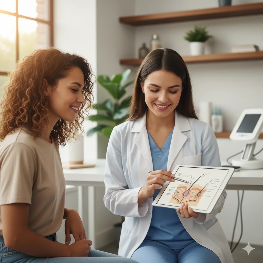 A dermatologist in a white coat having a friendly consultation with a patient about hair care.