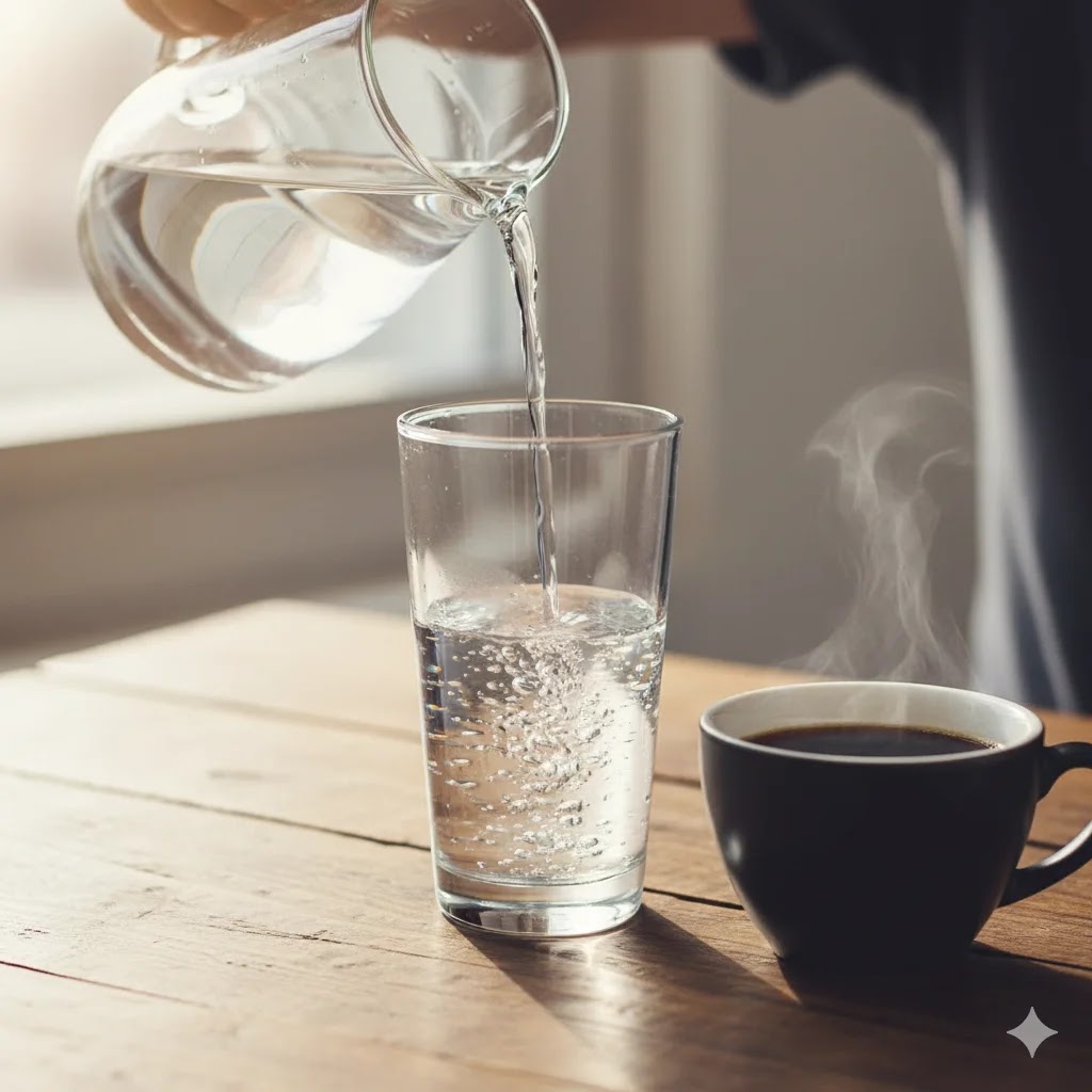 A person pouring a glass of water next to a cup of black coffee on a wooden table.
