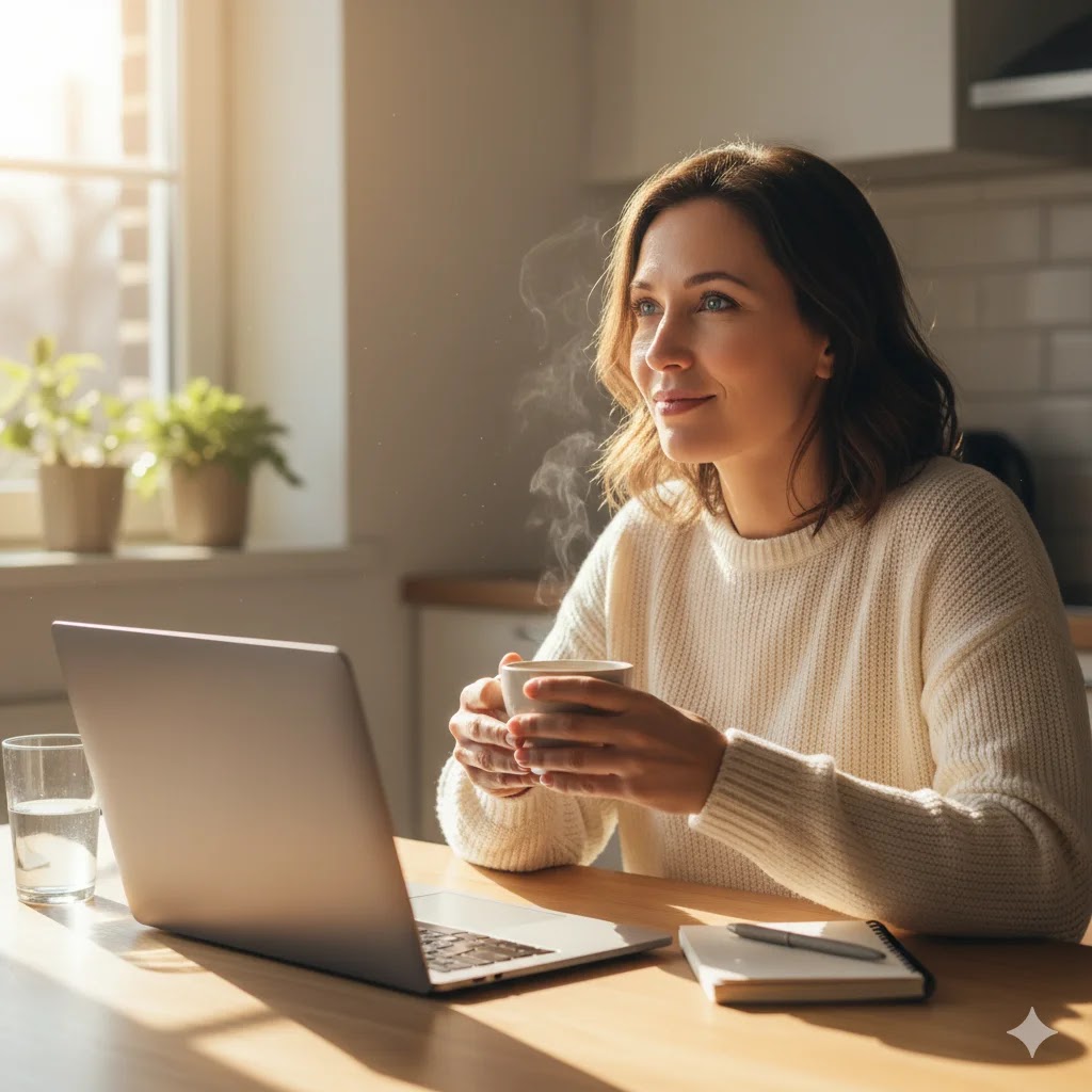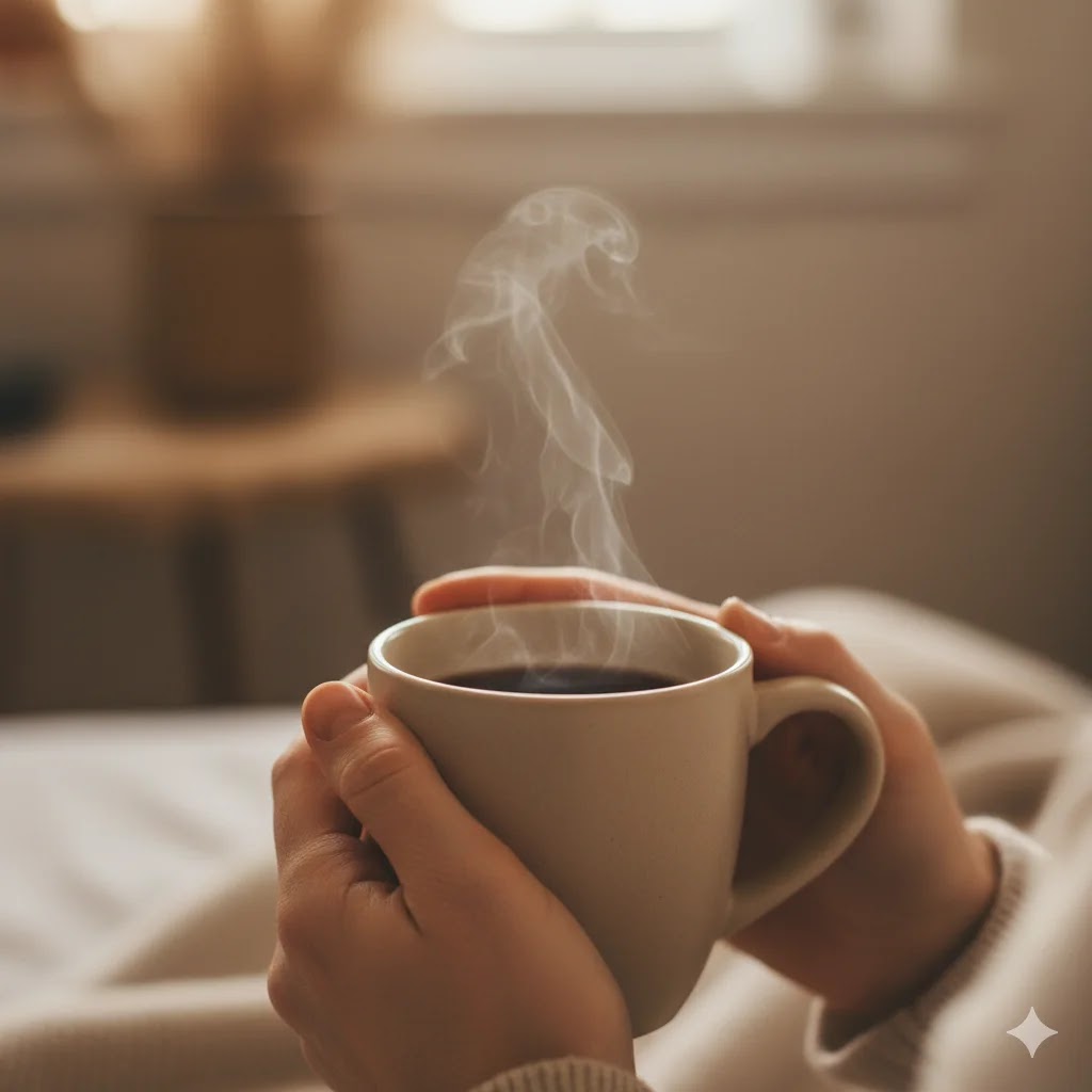 A person's hands mindfully cradling a warm, steaming mug of coffee in a soft-focused background.