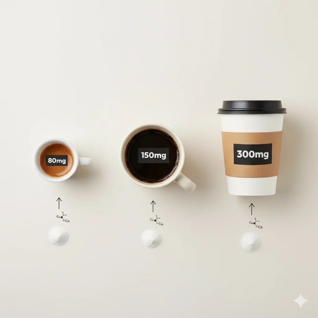 Infographic-style photo comparing caffeine content in an espresso, mug, and large to-go cup.