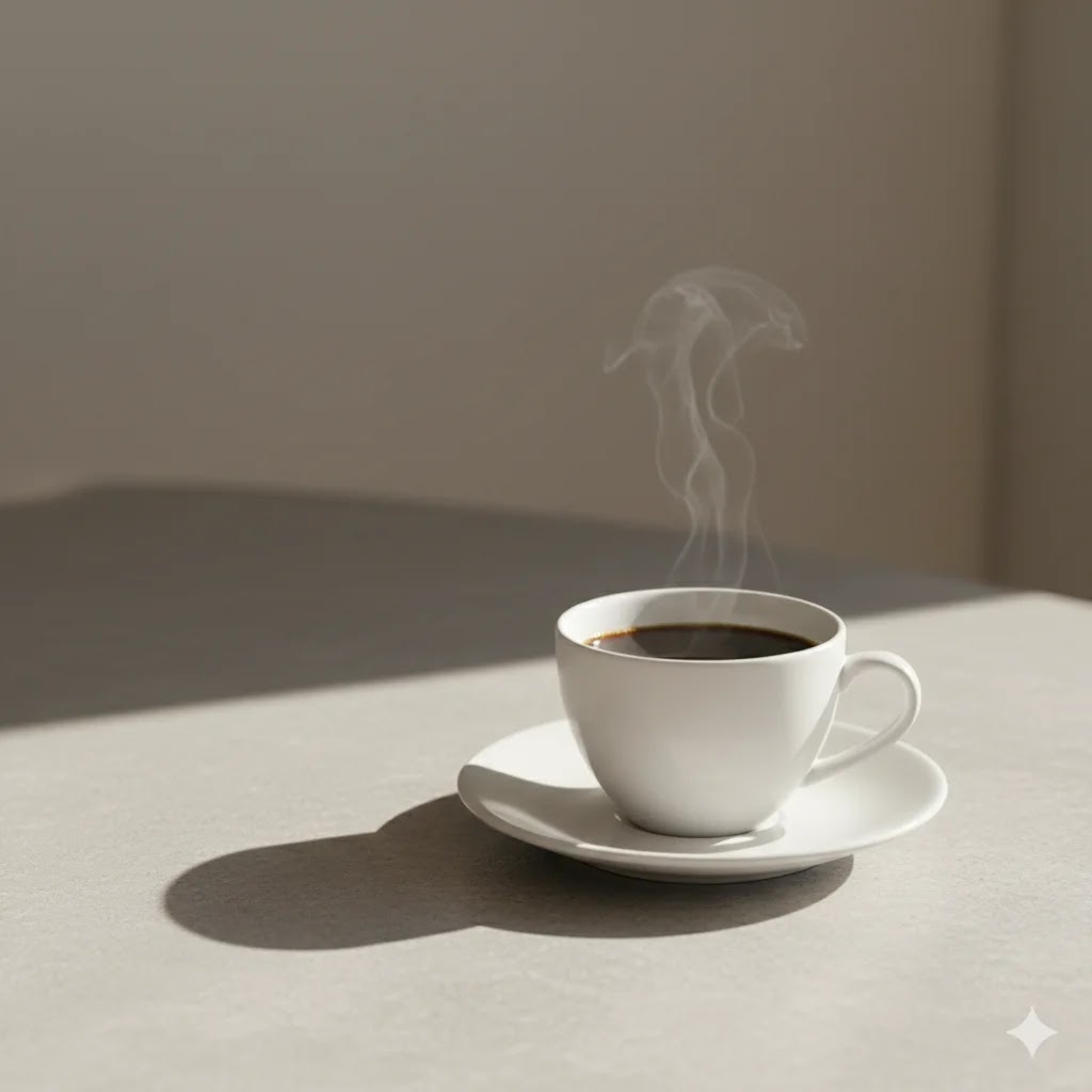 A simple, minimalist still life of a perfect cup of black coffee on a saucer in soft light.