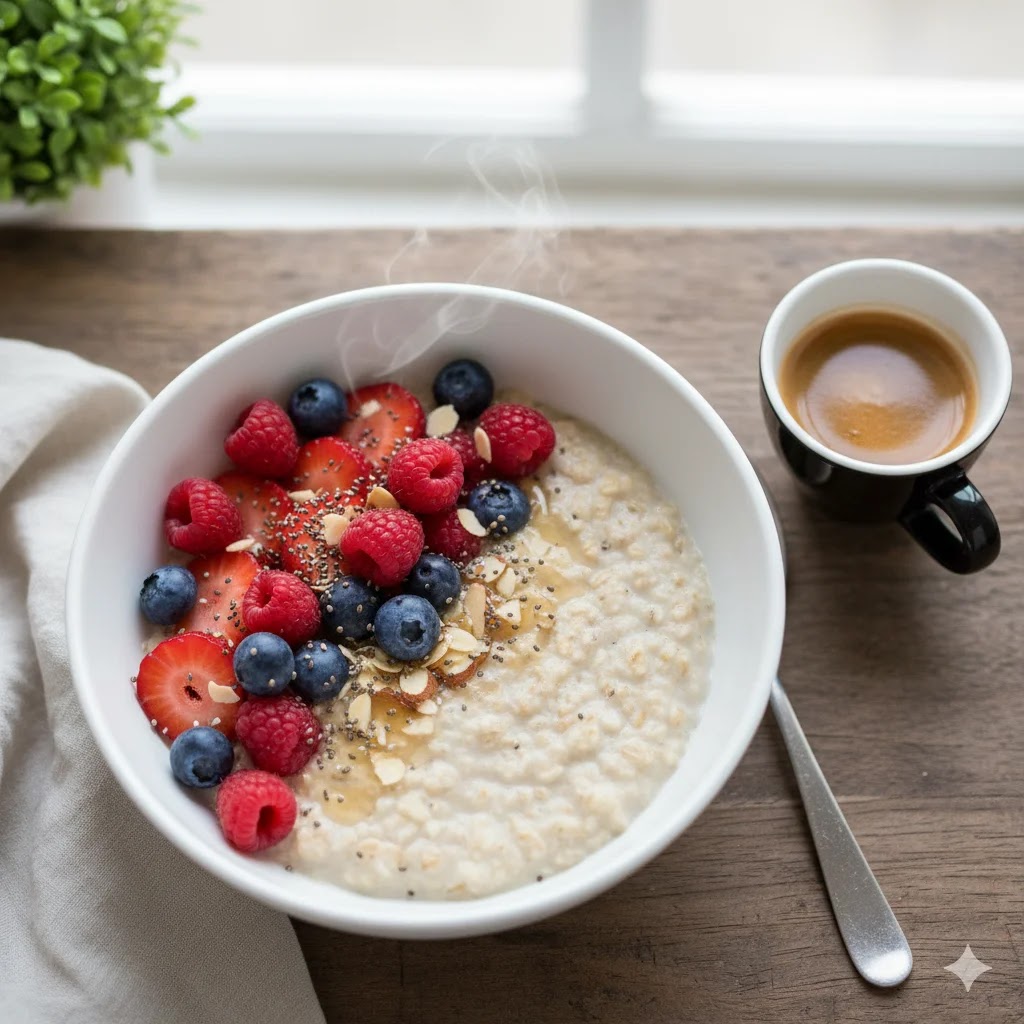 A healthy breakfast bowl with berries and oatmeal next to a small cup of espresso.