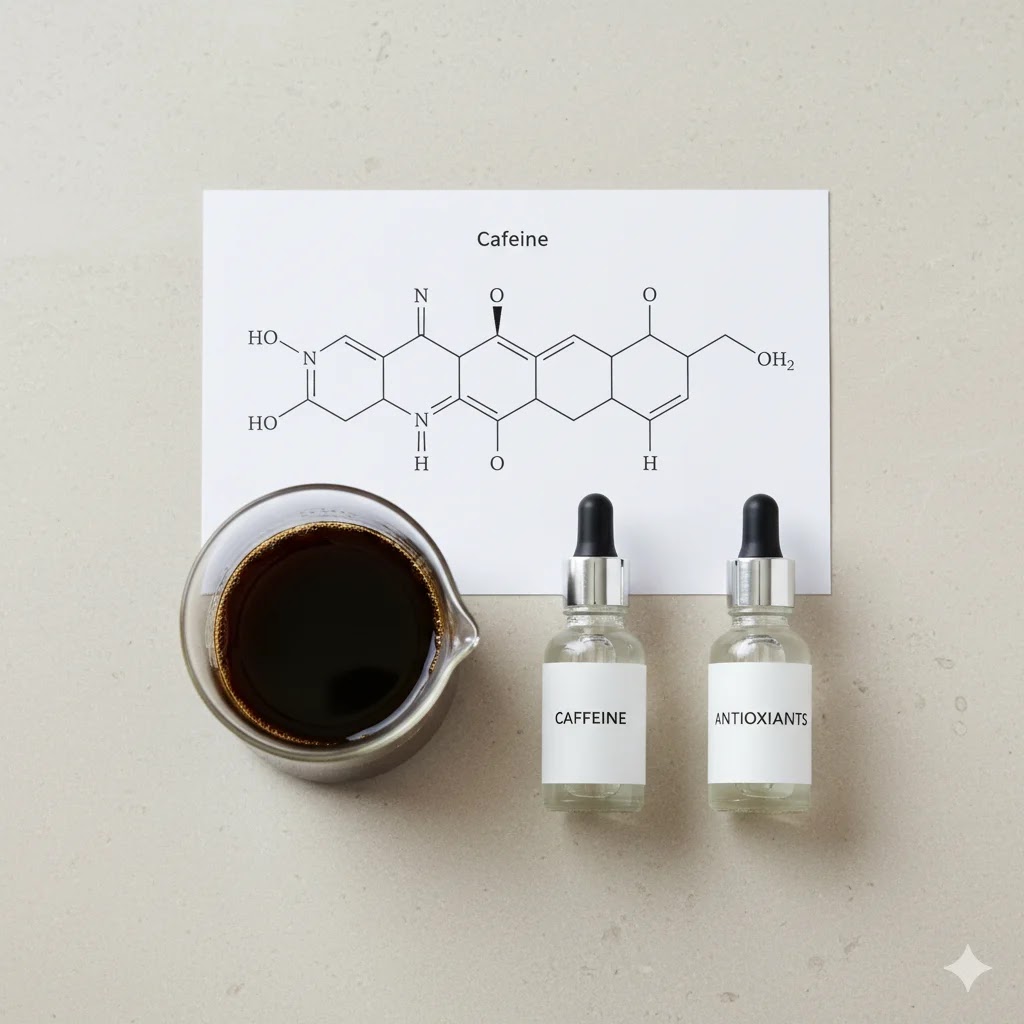 Scientific flat-lay showing coffee in a beaker next to bottles labeled Caffeine and Antioxidants.