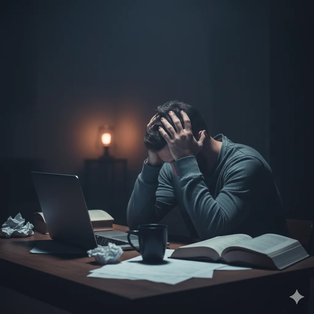 A stressed person with an empty coffee cup at a laptop late at night, showing fatigue.