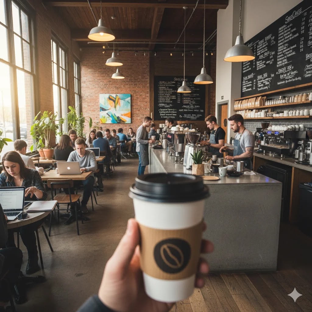 A bustling modern coffee shop with people enjoying coffee together and working on laptops.