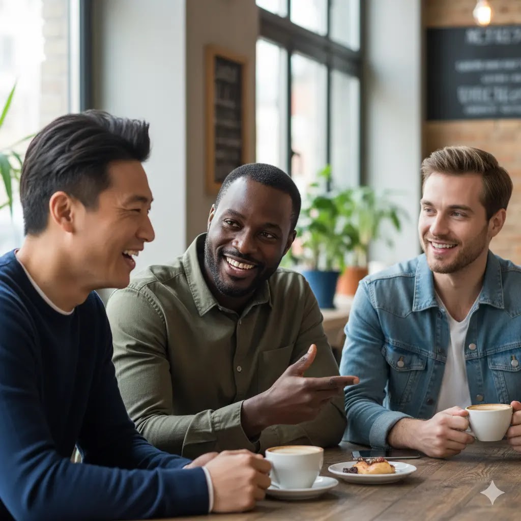 A diverse group of confident, well-groomed men laughing together at a casual social gathering.