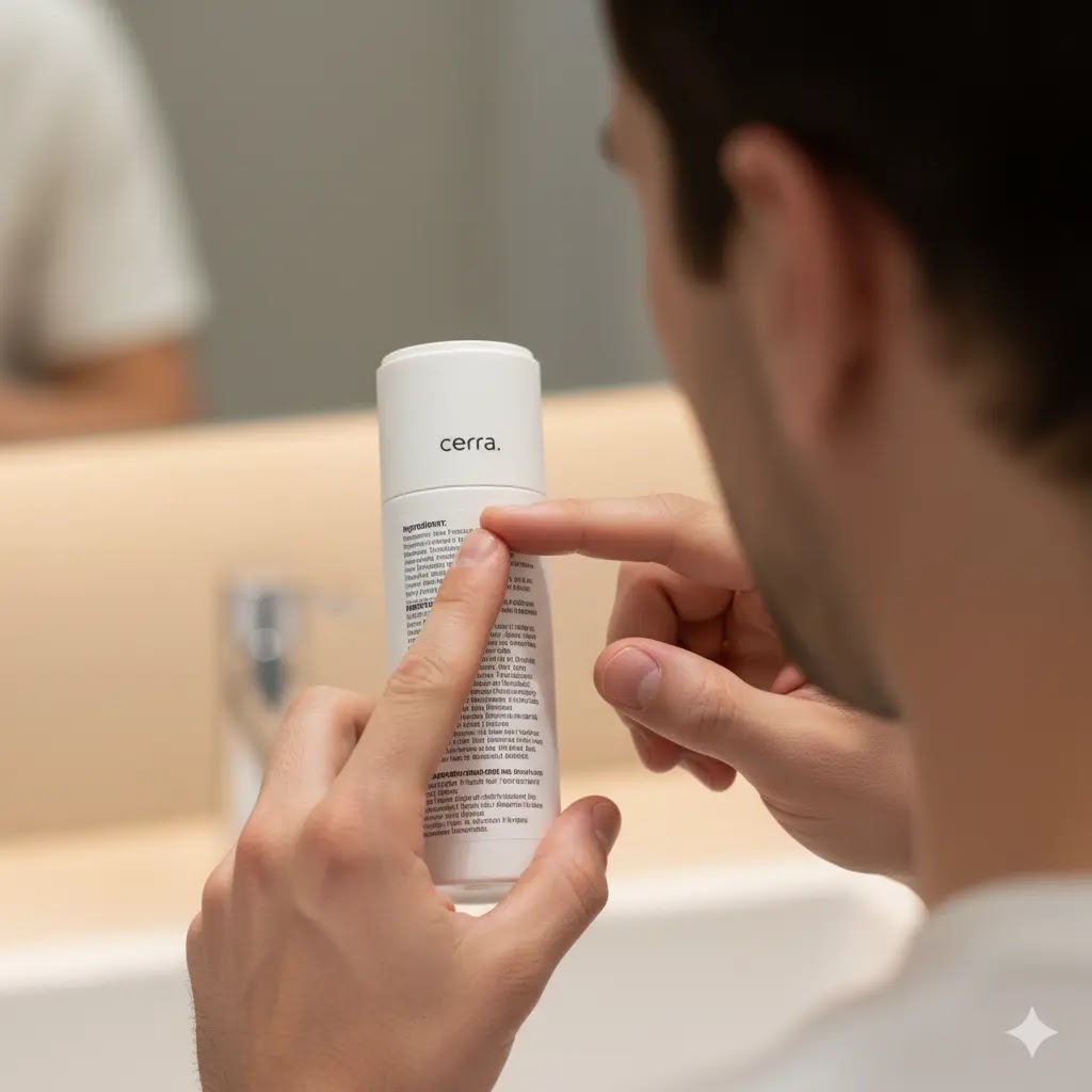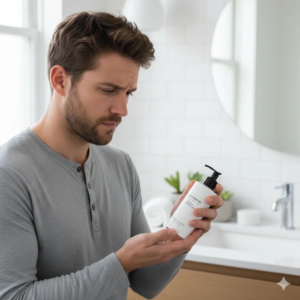 Close-up over-the-shoulder view of a man carefully reading the ingredient label on a skincare product.