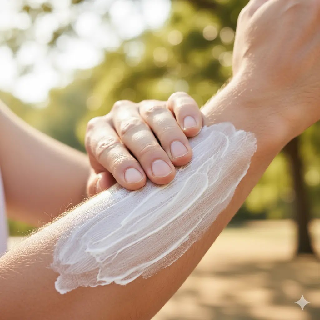 Close-up of a man's hands applying broad-spectrum sunscreen to his forearm for sun protection.