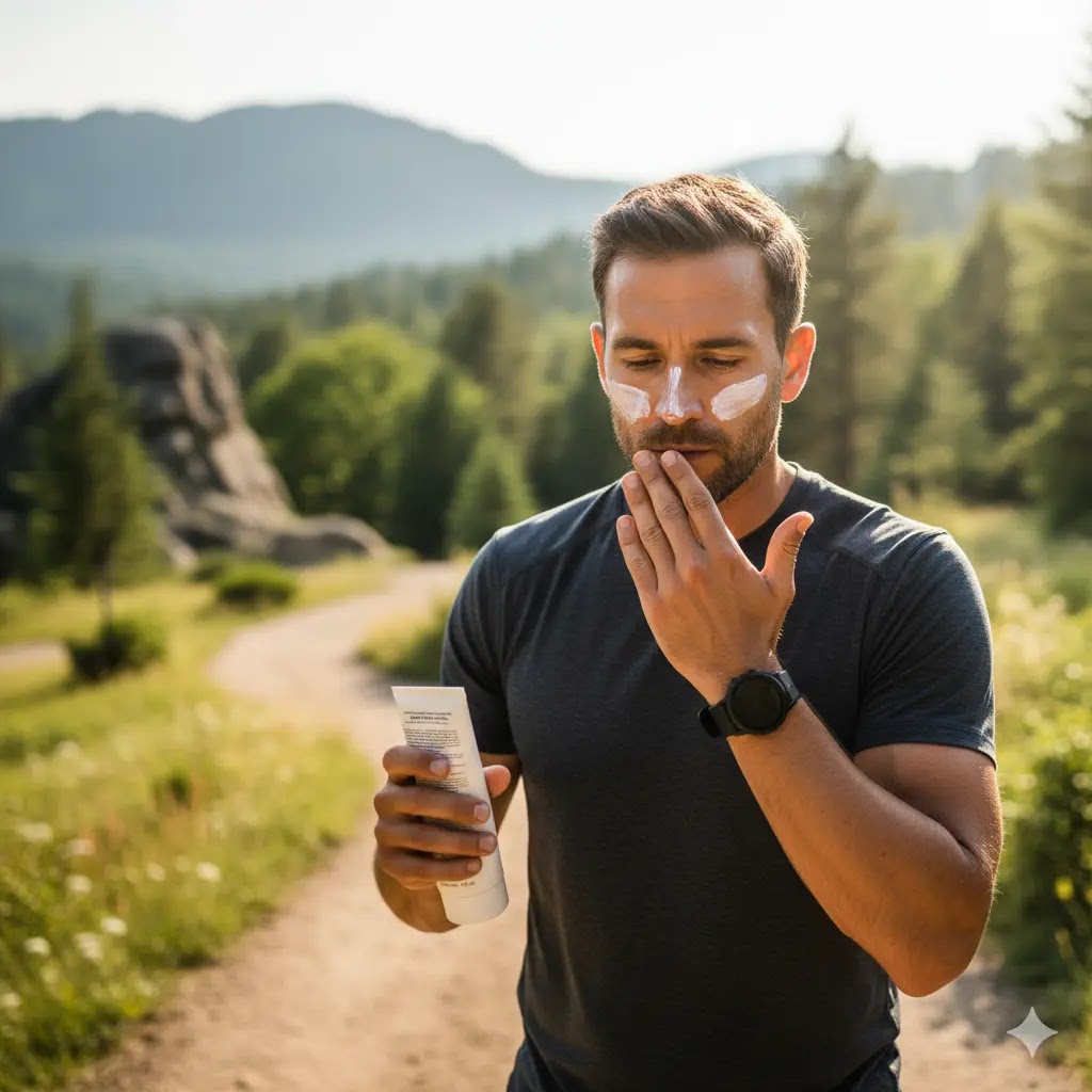An active man applying sunscreen outdoors before a run, demonstrating practical skincare for men.