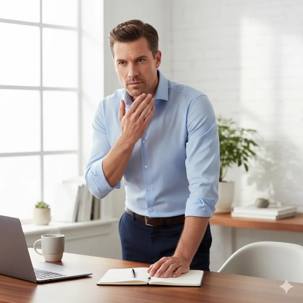 A confident professional man applying moisturizer at his home office desk before starting his workday.