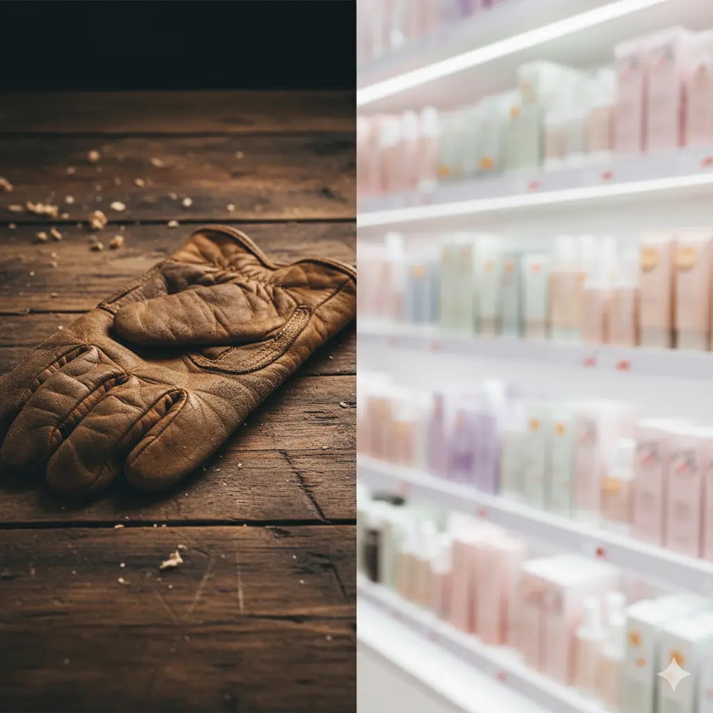 A conceptual split-image comparing a rugged work glove to a softly focused, feminine skincare aisle.