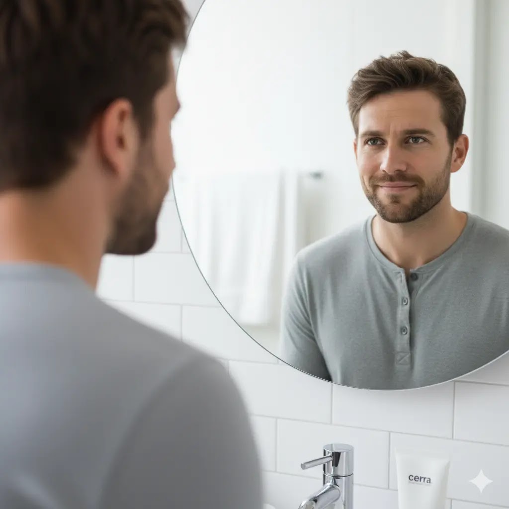 A man smiling with quiet satisfaction at his reflection in the mirror after completing his skincare routine.
