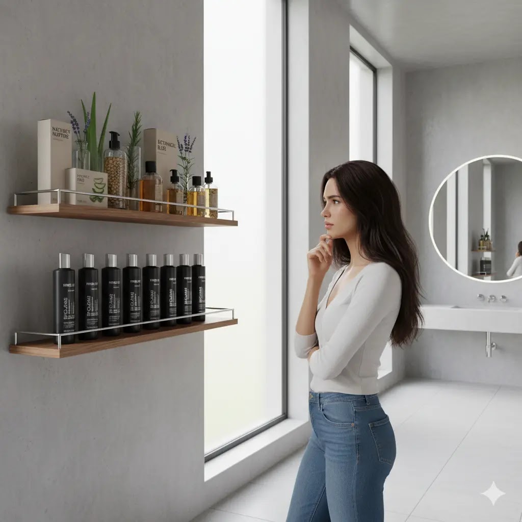 A person comparing shelves of natural hair care products with botanicals to shelves of synthetic salon products in a modern bathroom. Natural vs. Artificial Hair Care