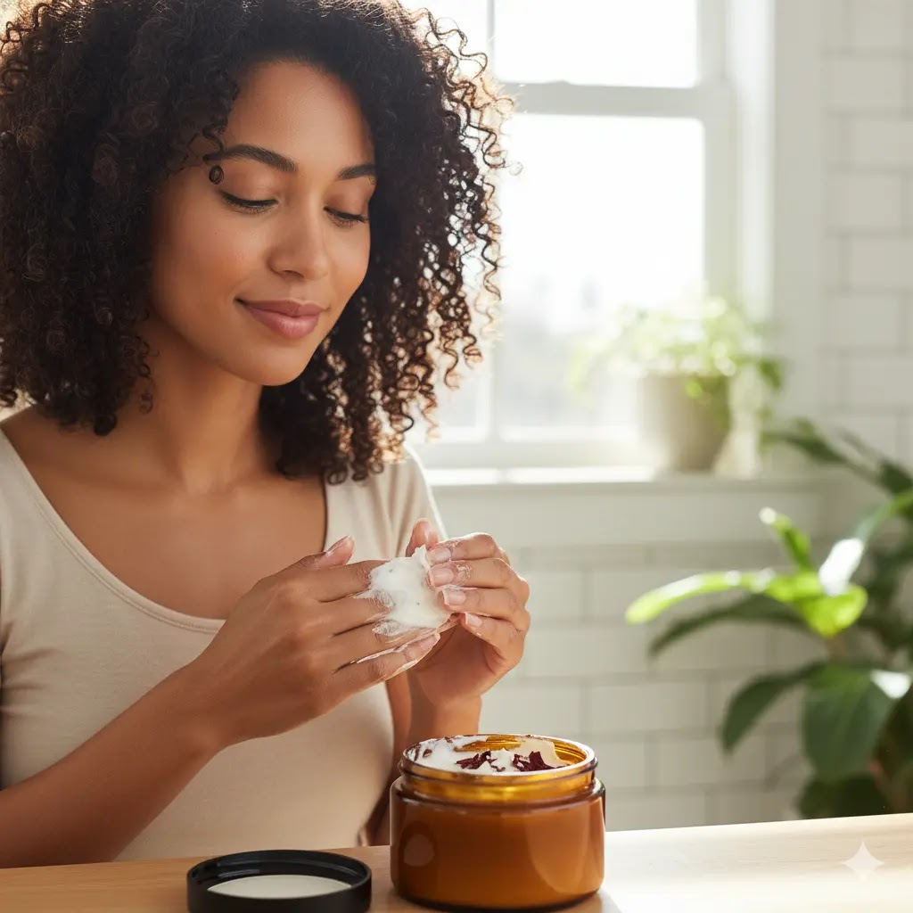 A woman with curly hair happily applying a creamy natural hair mask from a jar containing flax seeds.
