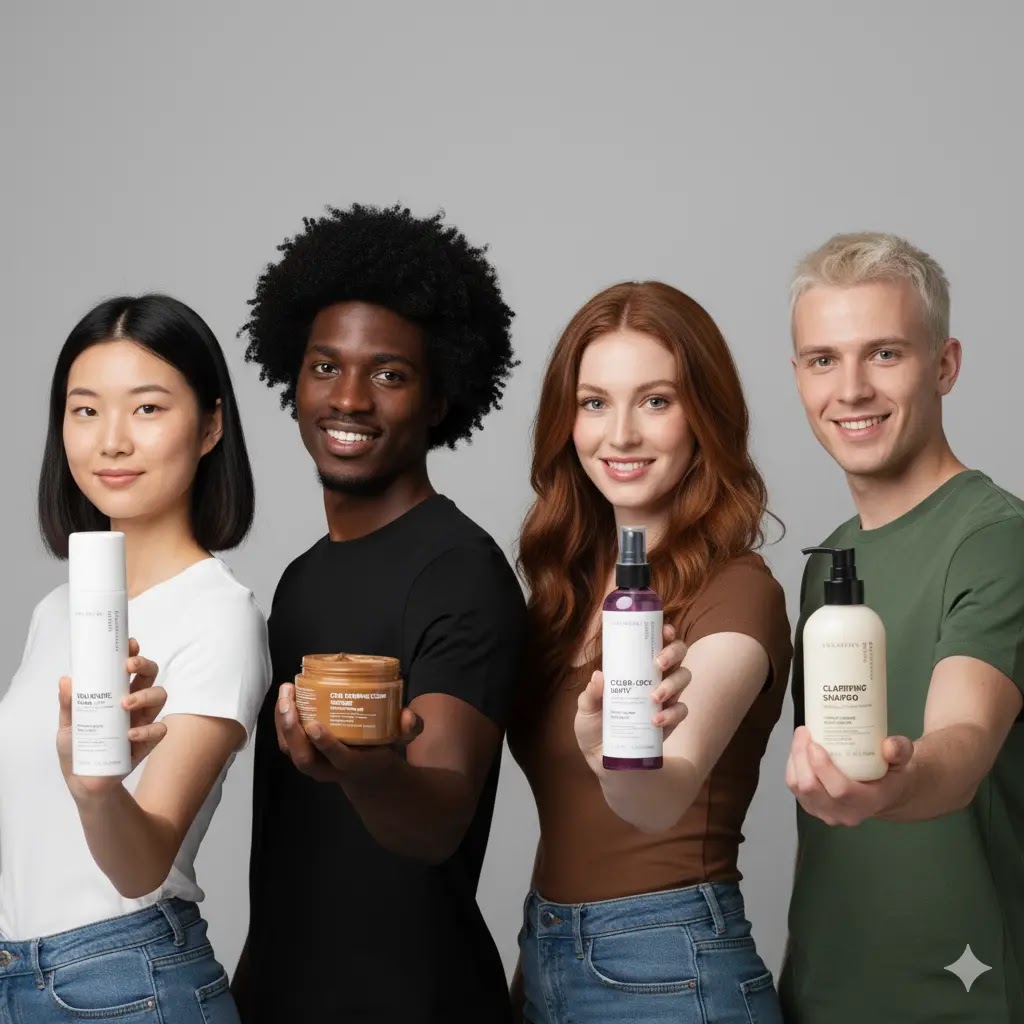A diverse group of people with different hair types each holding a hair product suitable for their needs.