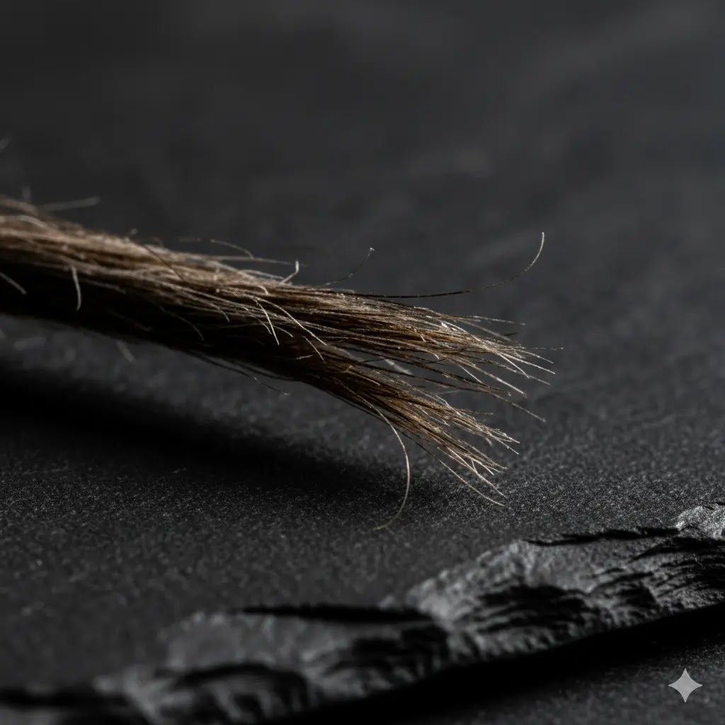 Extreme close-up of a single strand of damaged hair showing dryness, brittleness, and split ends.