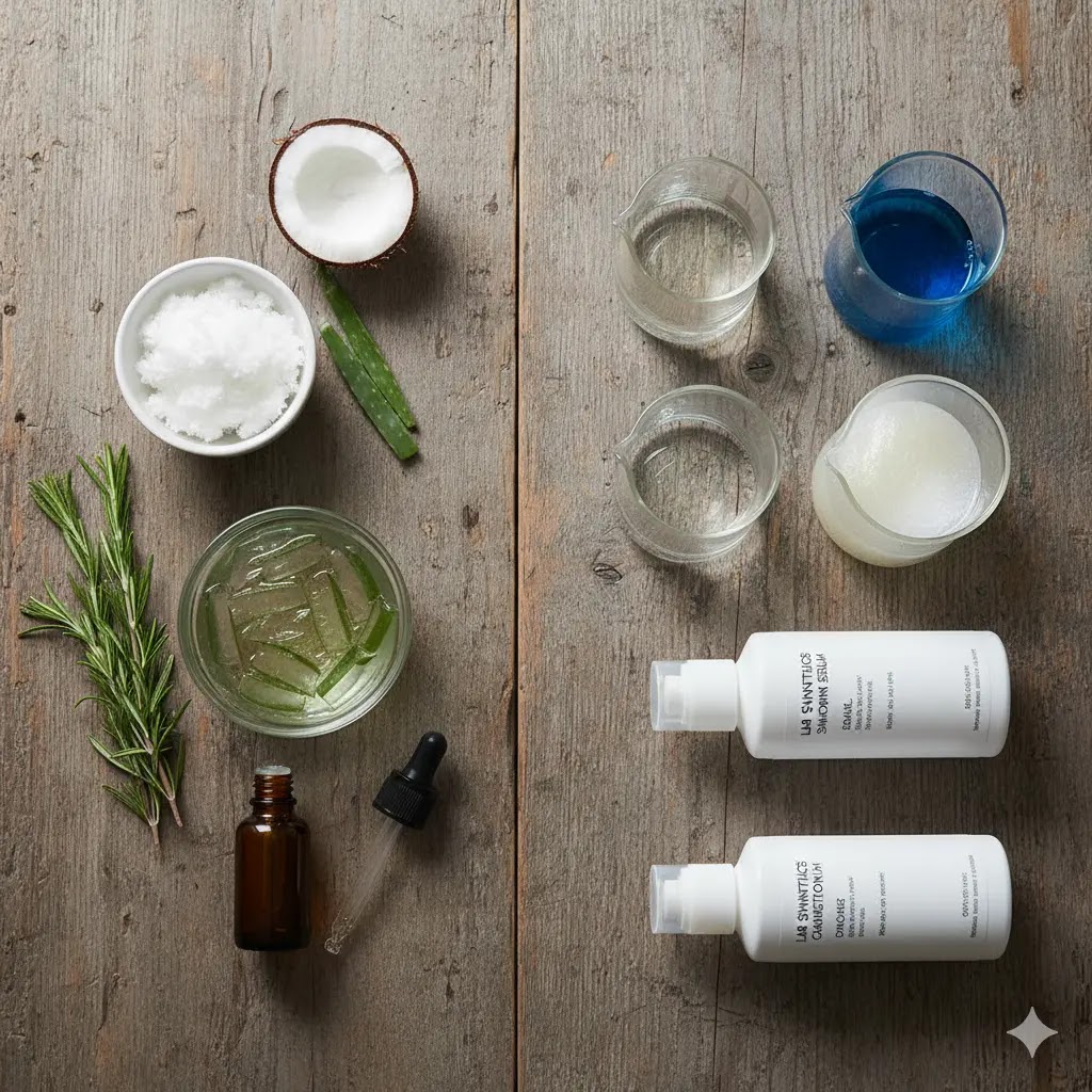 Overhead flat-lay comparing raw natural hair ingredients like coconut oil and rosemary to laboratory beakers and bottles of synthetic formulas.