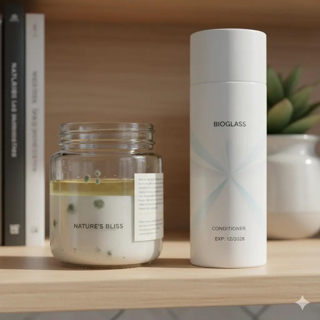 Close-up of a spoiled natural hair product with mold next to a sealed long-lasting synthetic hair product.