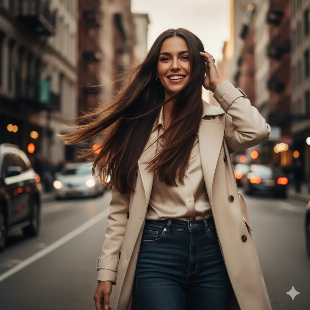 A confident woman with perfectly smooth and shiny hair running her fingers through it on a city street.