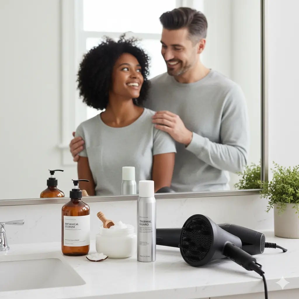 A balanced bathroom vanity with both natural hair care products like coconut oil and synthetic products like heat protectant spray.