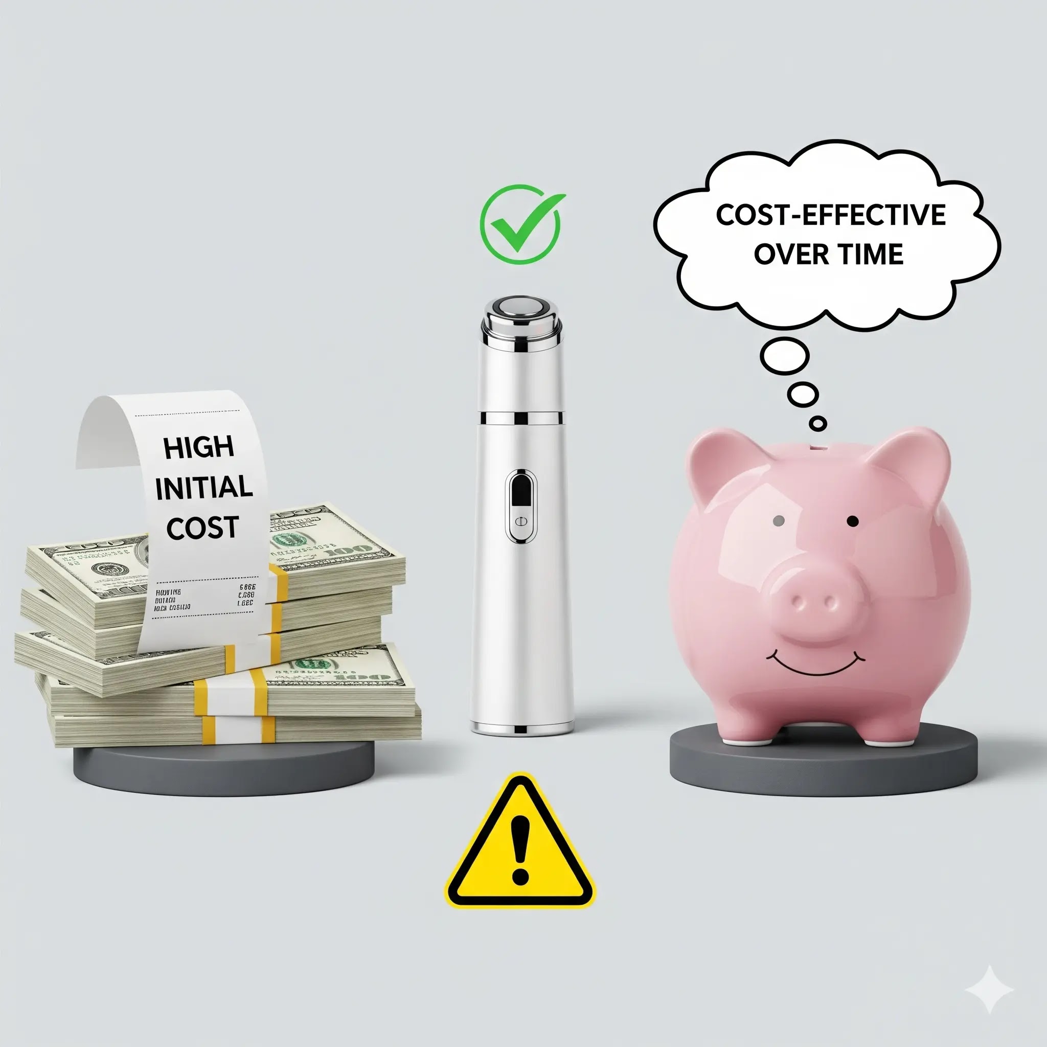 Conceptual still life with a skincare device balanced between a stack of money (representing cost) and a piggy bank (representing long-term value).