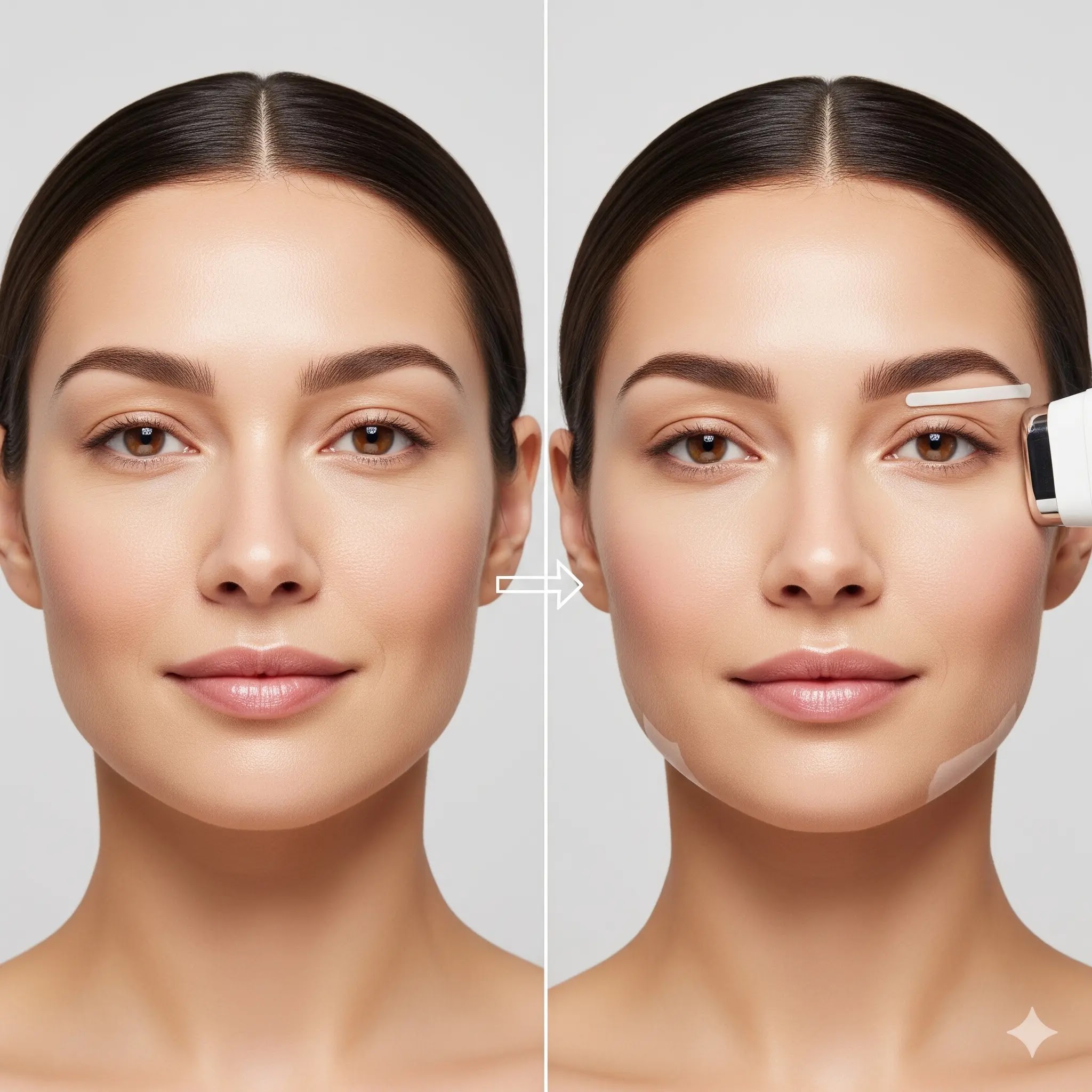Side-by-side comparison showing the temporary contouring and lifting effect of a microcurrent device on a woman's jawline and brow.