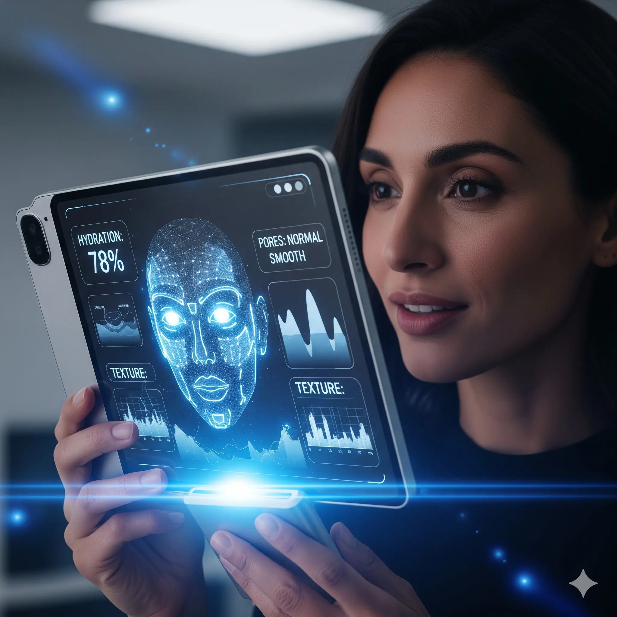 Futuristic concept of a woman using an AI skin scanner tablet that displays a holographic 3D model of her face with real-time skin analysis data.
