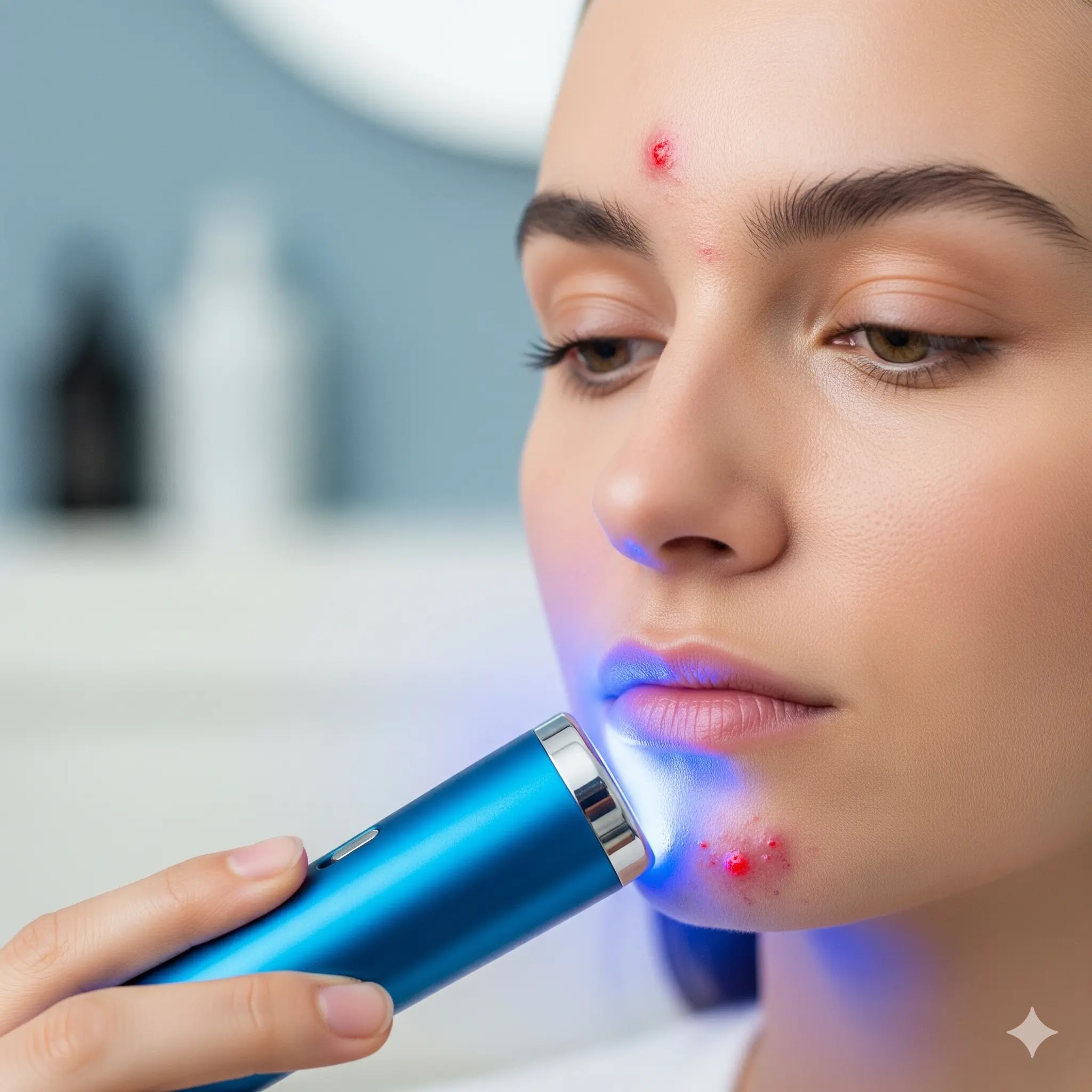 Close-up of a handheld blue light therapy device emitting a cool blue glow onto skin with visible blemishes, representing a targeted treatment.