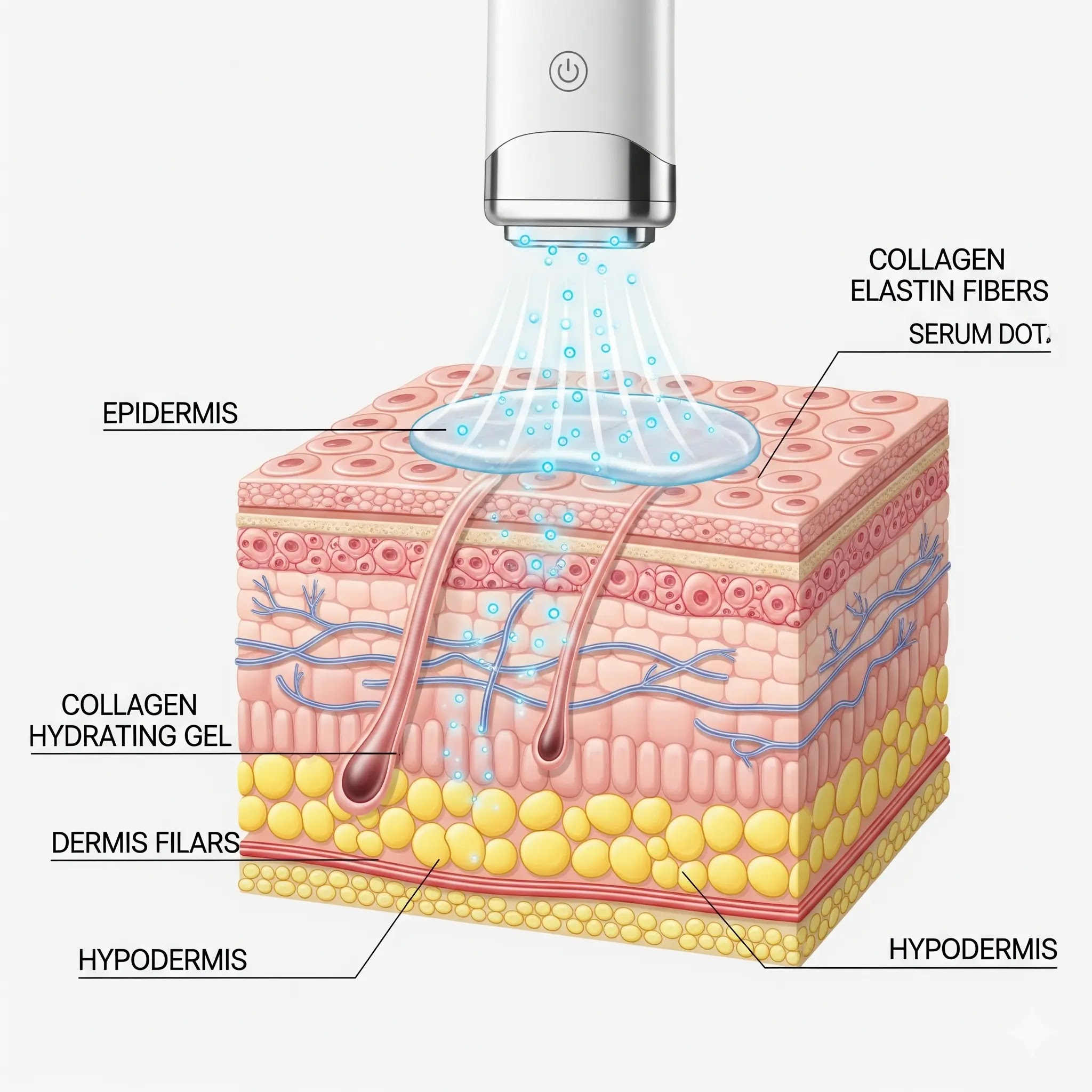 Illustrative cross-section diagram of skin layers showing ultrasonic waves from a device helping serum particles absorb deeper into the skin.