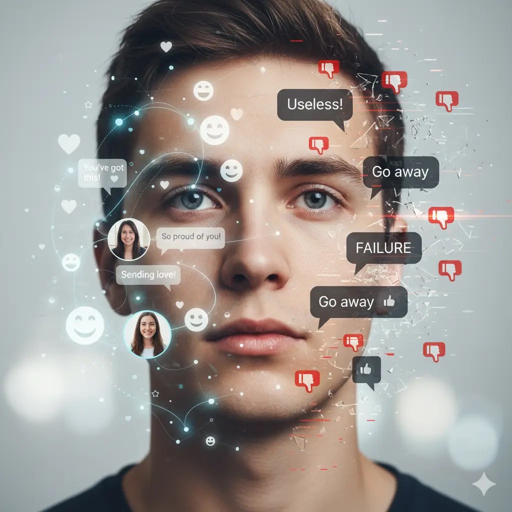Conceptual double-exposure portrait of a serene young person with positive and negative social media icons overlayed on their face.