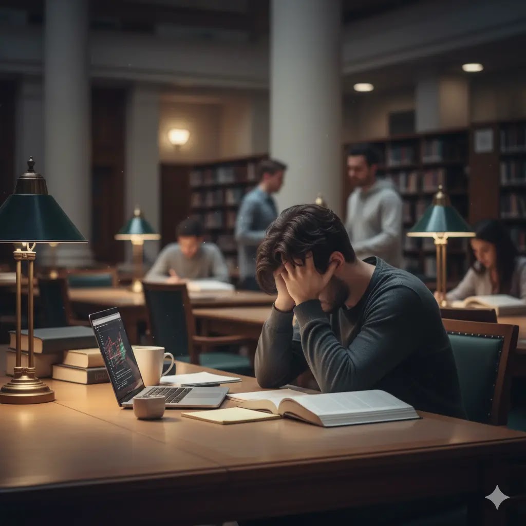 Frustrated young student with their head in their hands, unable to focus on their laptop and books in a library.