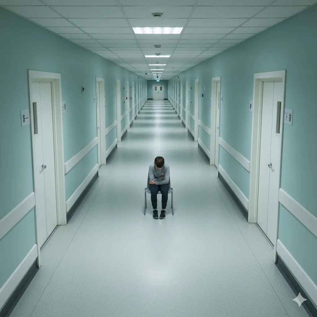 A lone young person sitting on a chair in a long, empty, brightly lit hospital hallway, waiting.